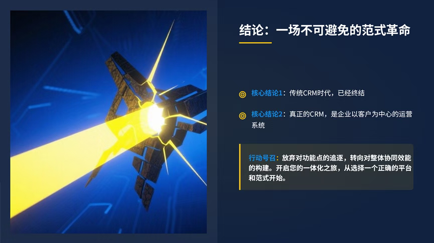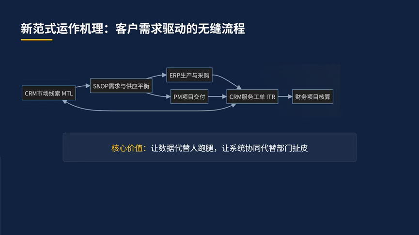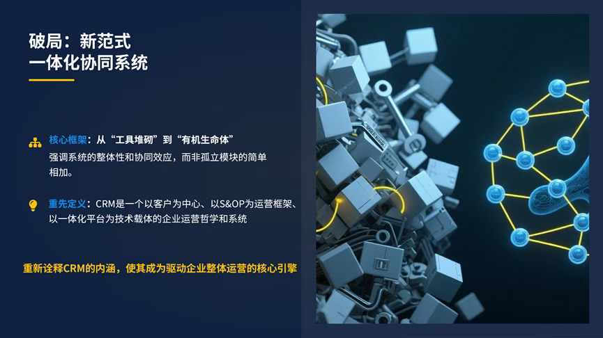 AI赋能的智能S&OP:利用AI进行需求预测、风险预警、自动排产。 产业级协同:将客户、供应商、合作伙伴纳入同一协同网络。 第五章:结论——一场不可避免的范式革命 本文宣告了传统孤立CRM时代的终结。真正的CRM,是一个以客户为中心、以S&OP为运营框架、以一体化平台为技术载体的“企业运营哲学和系统”。它不再是软件的名称,而是“企业的一种生存方式和核心竞争力”。呼吁行业放弃对功能点的追逐,转向对整体协同效能的构建。