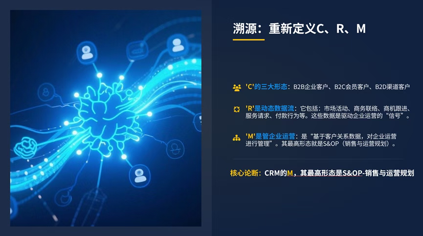 2.1 “C”的本质:客户作为企业价值的唯一源头 我们明确提出客户的三元形态,这是整个理论的基石: B2B(企业客户):关注“决策链、客户规模、项目商机”。销售是“猎人+农夫”,过程复杂。 B2C(个人/会员客户):关注“会员资产、消费行为、生命周期价值(LTV)、积分与忠诚度”。运营是核心。 B2D(渠道客户):即DMS(分销管理系统),关注“渠道库存、销售政策、返利体系、忠诚度”。关系是核心。 论断:任何企业的CRM策略,都必须首先明确其服务的客户主体形态,混合形态需有主次之分。 2.2 “R”的本质:关系作为动态的数据流 “关系”不是虚无的概念,而是“一系列可被记录、分析和运营的交互行为数据集合”。 它包括:市场活动、商务联络、商机跟进、服务请求、付款行为等。这些数据是驱动企业运营的“信号”。 2.3 “M”的本质:管理作为S&OP的协同 颠覆性观点:CRM中的“M”并非“管理客户”,而是“基于客户关系数据,对企业运营进行管理”。其最高形态就是S&OP(销售与运营规划)。 S&OP是一个动态平衡需求(来自CRM)与供应(来自ERP、SCM)的月度循环流程。CRM是S&OP的“需求侧输入核心”。 第三章:新范式——以S&OP为核心的一体化协同系统