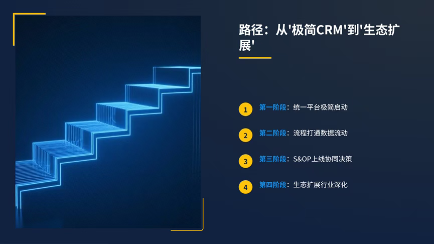 第一步:在同一平台上,部署极简CRM(聚焦线索、客户、联系人、商机)。 第二步:打通关键流程,如CRM商机 -> ERP订单-> OA审批。 第三步:全面推行S&OP流程,将销售、运营、财务会议机制建立在平台数据之上。 第四步:按行业扩展(+PM, +SCM, +MES),形成完整解决方案。